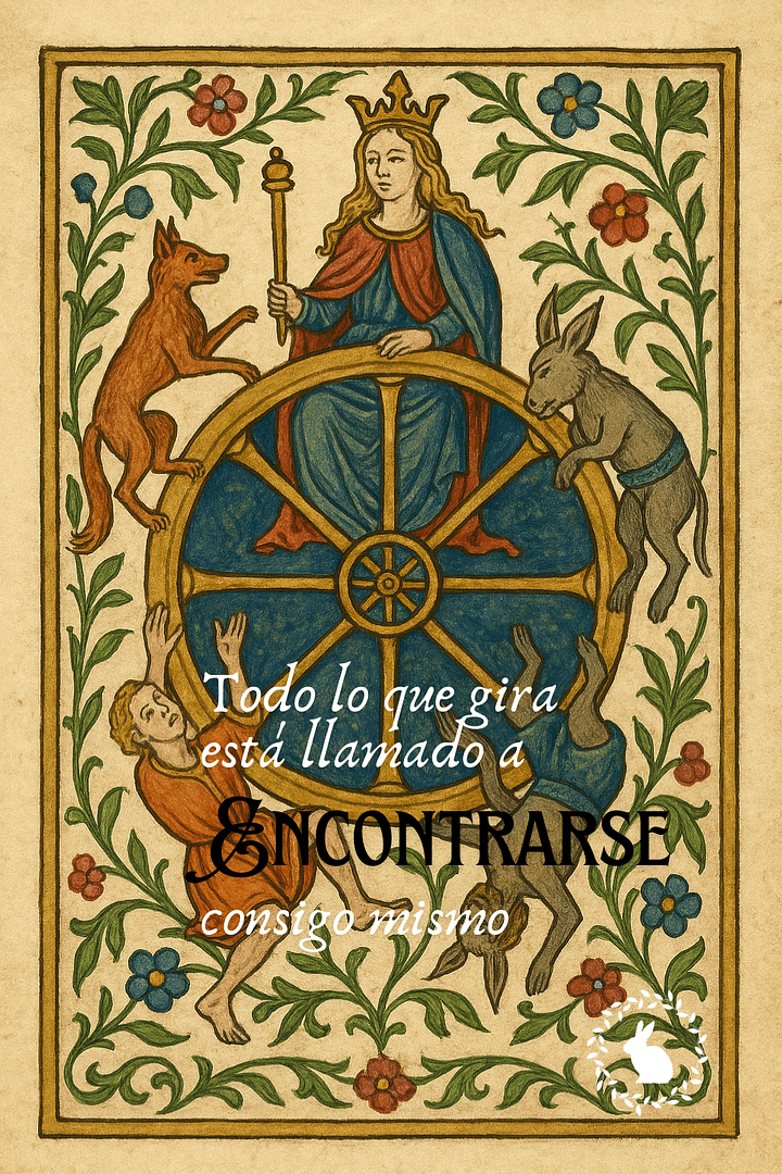 El Arcano 10, La Rueda de la Fortuna, nos confronta con la inevitable rueda del destino. Aquí se manifiestan los ciclos que giran sin descanso, la ley del cambio constante, el ritmo inexorable de la vida y la muerte que se suceden. La Rueda nos saca del falso sentido de permanencia, desestabiliza las certezas y nos coloca ante la fluidez del universo. Es el giro necesario que desencadena la crisis y el movimiento.